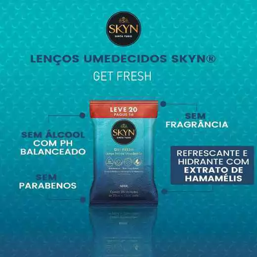 O Lenço Íntimo Umedecido Skyn Get Fresh - 20un é um produto de extrema qualidade que cuidará de forma plena de você, com todo o carinho e qualidade que o seu corpo merece!! Os Lenços umedecidos da Skyn Get Fresh possuem em sua fórmula extratos especiais de Hamamélis em uma solução de limpeza sem sabão, de pH balanceado. Ginecologicamente e dermatologicamente testado, não contém Parabenos ou Álcool Etílico. Para que serve: O Lenço Íntimo Umedecido Skyn Get Fresh é uma maneira eficaz e discreta para higienizar e refrescar a região íntima. O Lenço Íntimo Umedecido Skyn Get Fresh é perfeito para levar na bolsa, é discreto, prático e pode ser usado em qualquer lugar e em qualquer lugar e em qualquer momento.